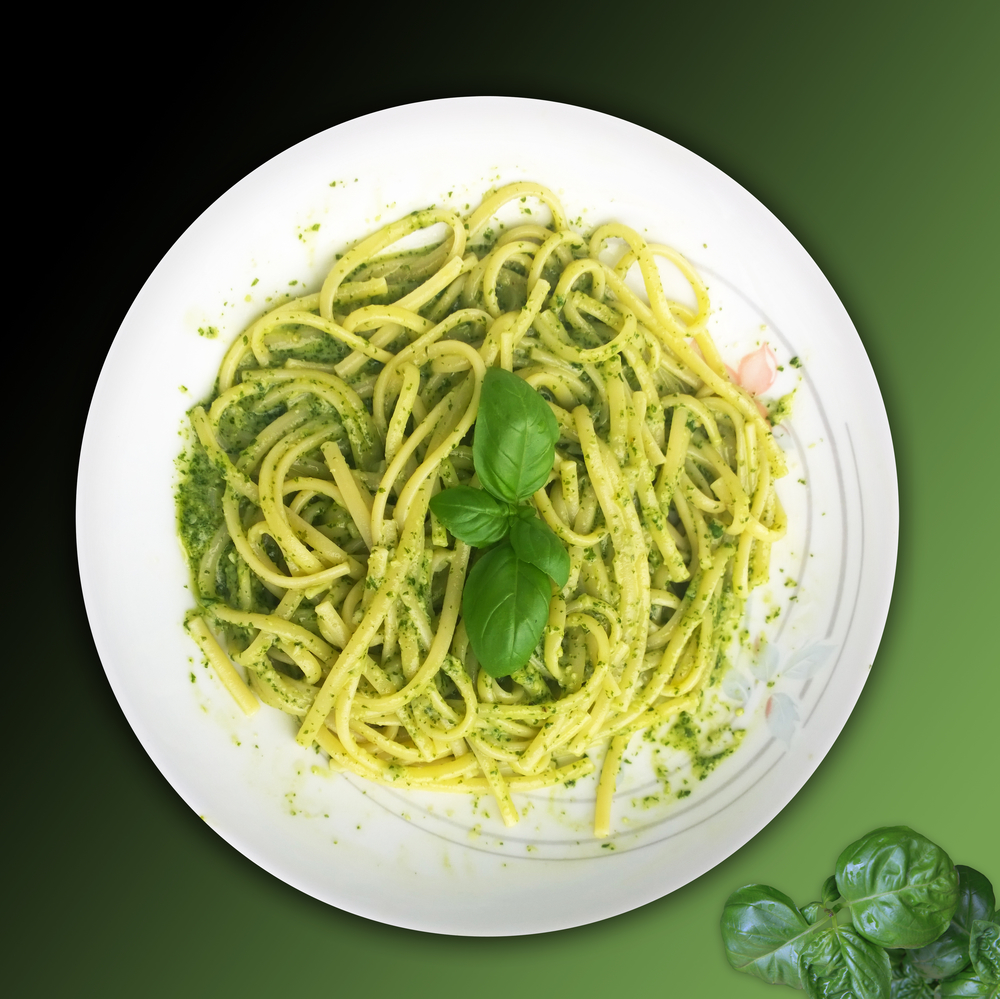 Italian food:linguine with pesto sauce ← Previous Next → Tasty and ever delicious Italian recipe: linguine with pesto sauce, condiment prepared on the spot with fresh basil, olive oli, garlic, pine nuts and parmesan cheese